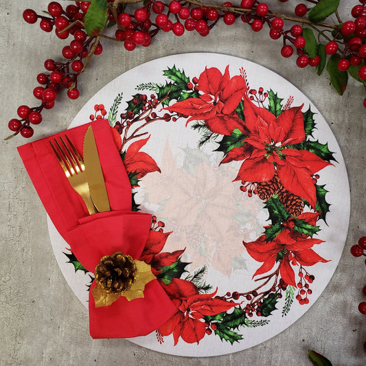 Set of 4 Round Placemats Covers Christmas Big Red Flower Cloth 14" Dia - Green