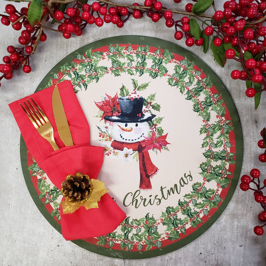 Set of 4 Round Placemats Covers Christmas Snowman Cloth 14" Dia | Beige