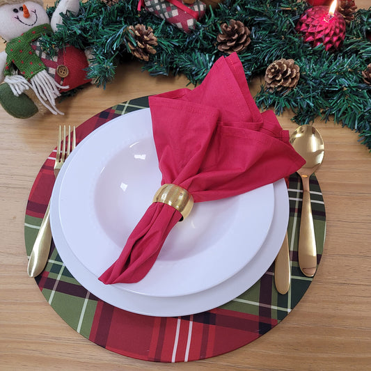 Set of 4 Round Placemats Covers Christmas Plaid Cloth 14" Dia | Red