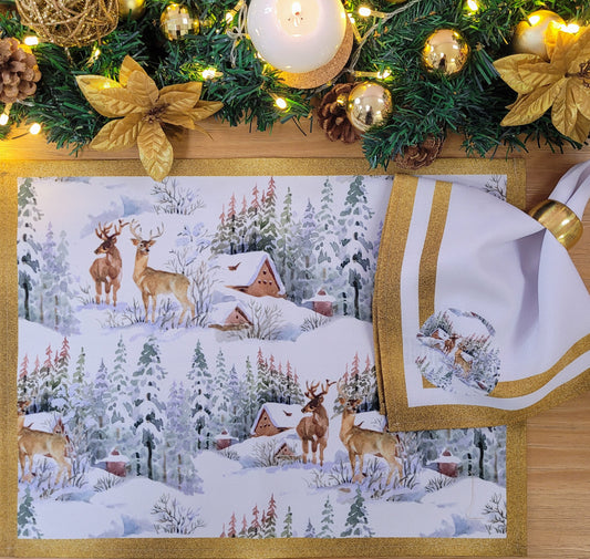 Set of 4 Placemats Christmas Reindeer Cloth Waterproof 17" by 13" - Gold