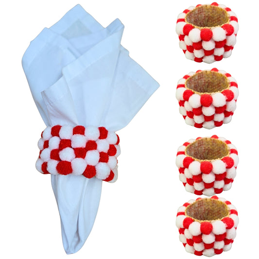 Charlo's Red & White Pom Pom Napkin Rings for Patriotic Holidays, Birthdays Dinner Table Decor