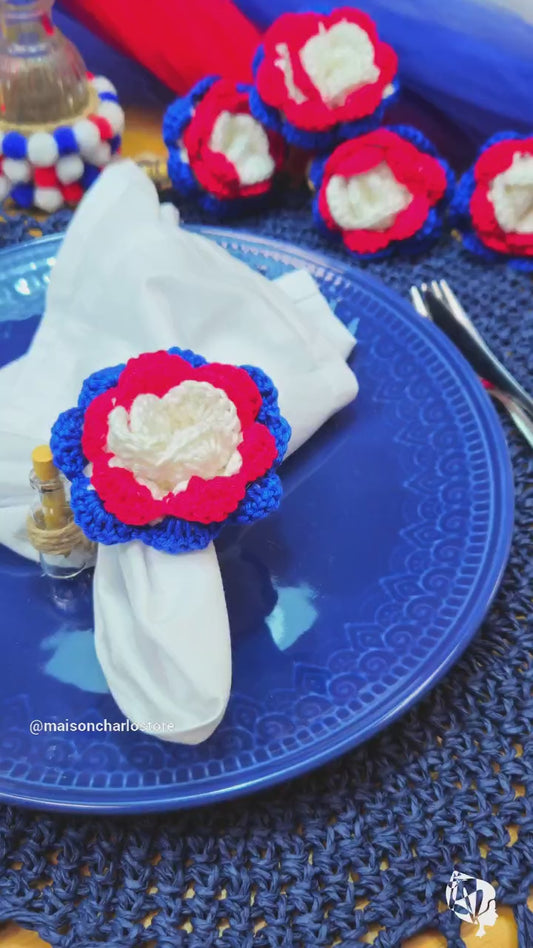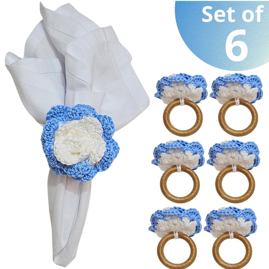 Charlo's Set of 6 Blue White Crochet Rosebud Flower Napkin Rings for Dinner Table Decor, Handmade, Table setting
