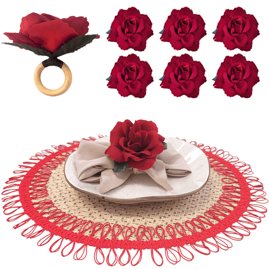 Maison Charlo Set of 6 Red Colombiana Rose Flower Rosebud Napkin Rings for dining table decor