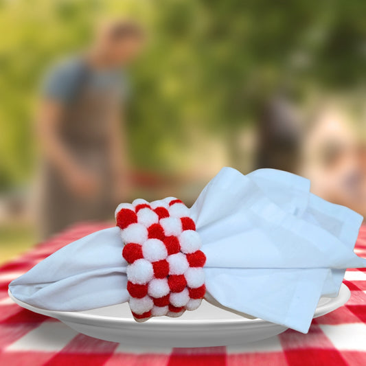 Charlo's Red & White Pom Pom Napkin Rings for Patriotic Holidays, Birthdays Dinner Table Decor