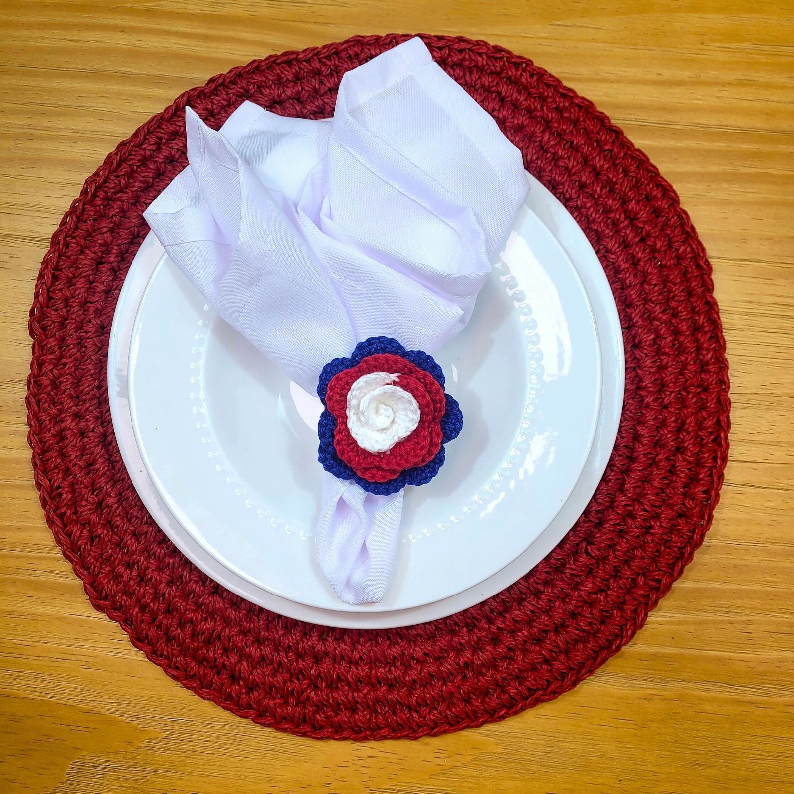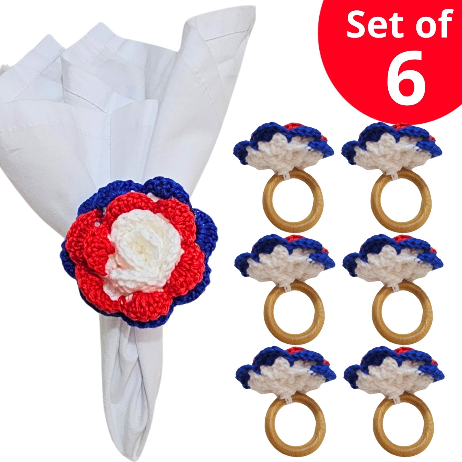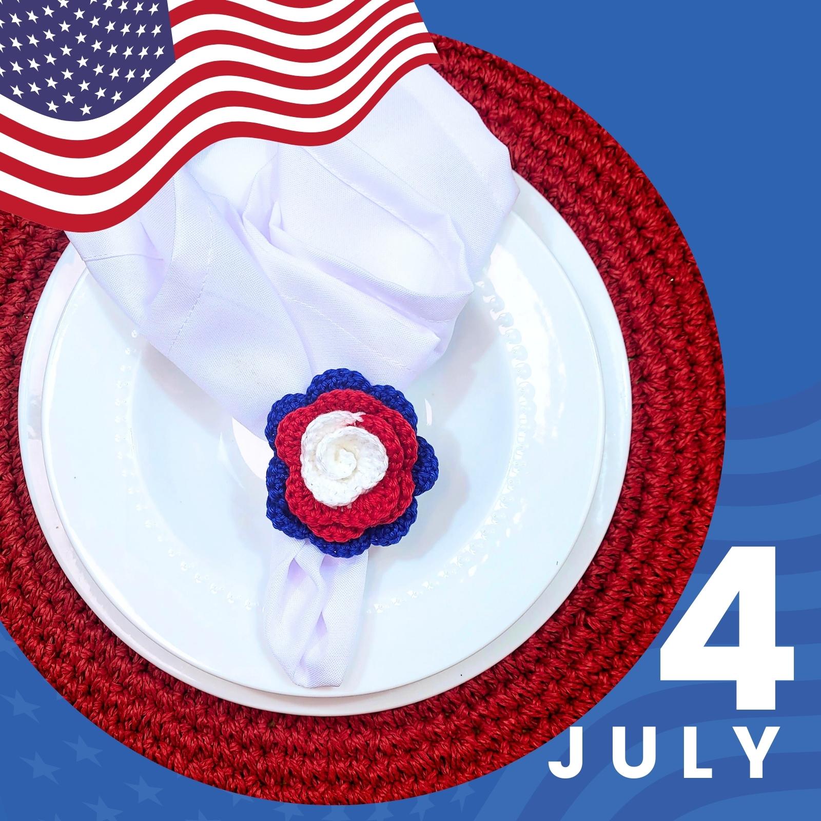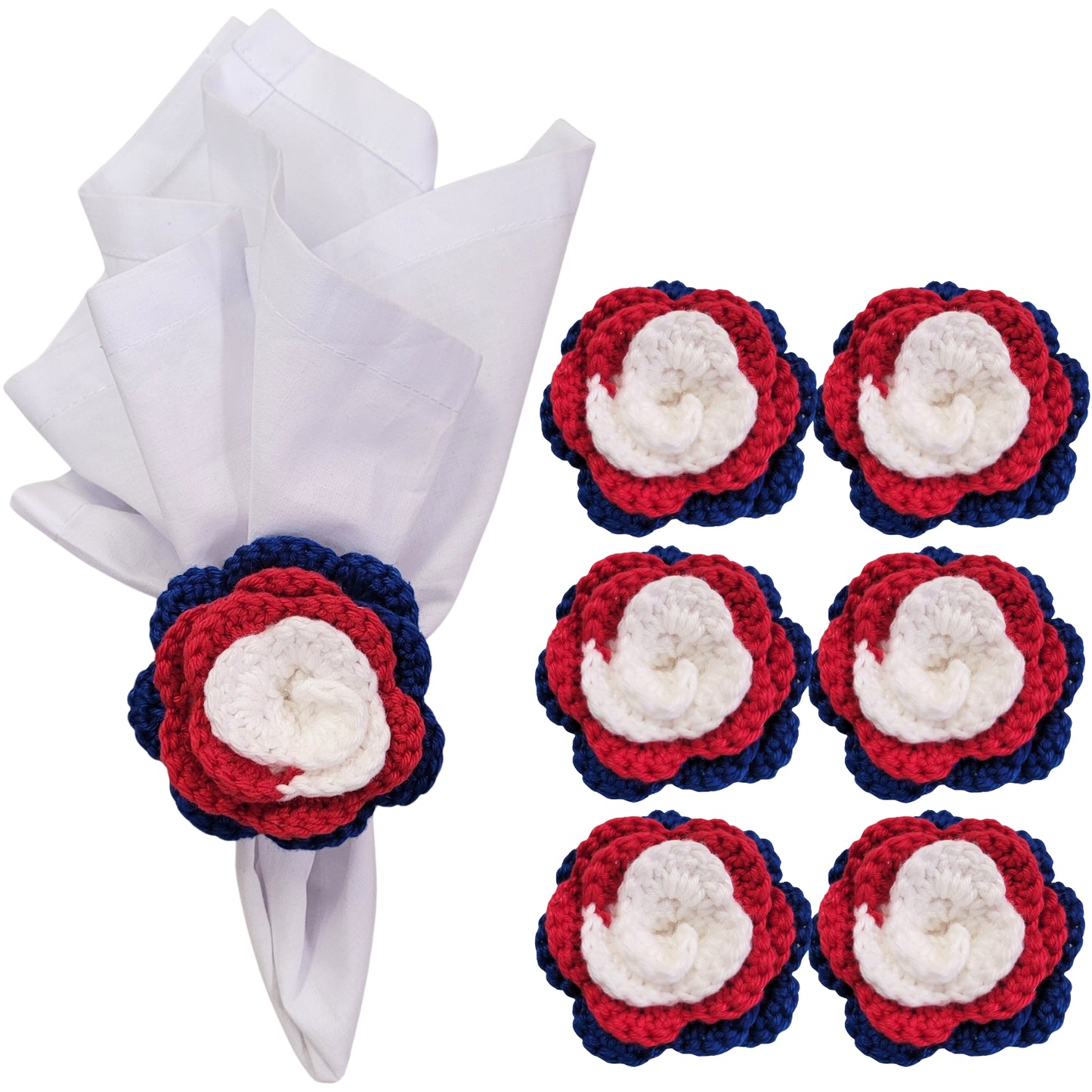 Charlo's Set of 6 USA Patriot Crochet Rosebud Napkin Rings for Independence Day, 4th of July, Memorial Day