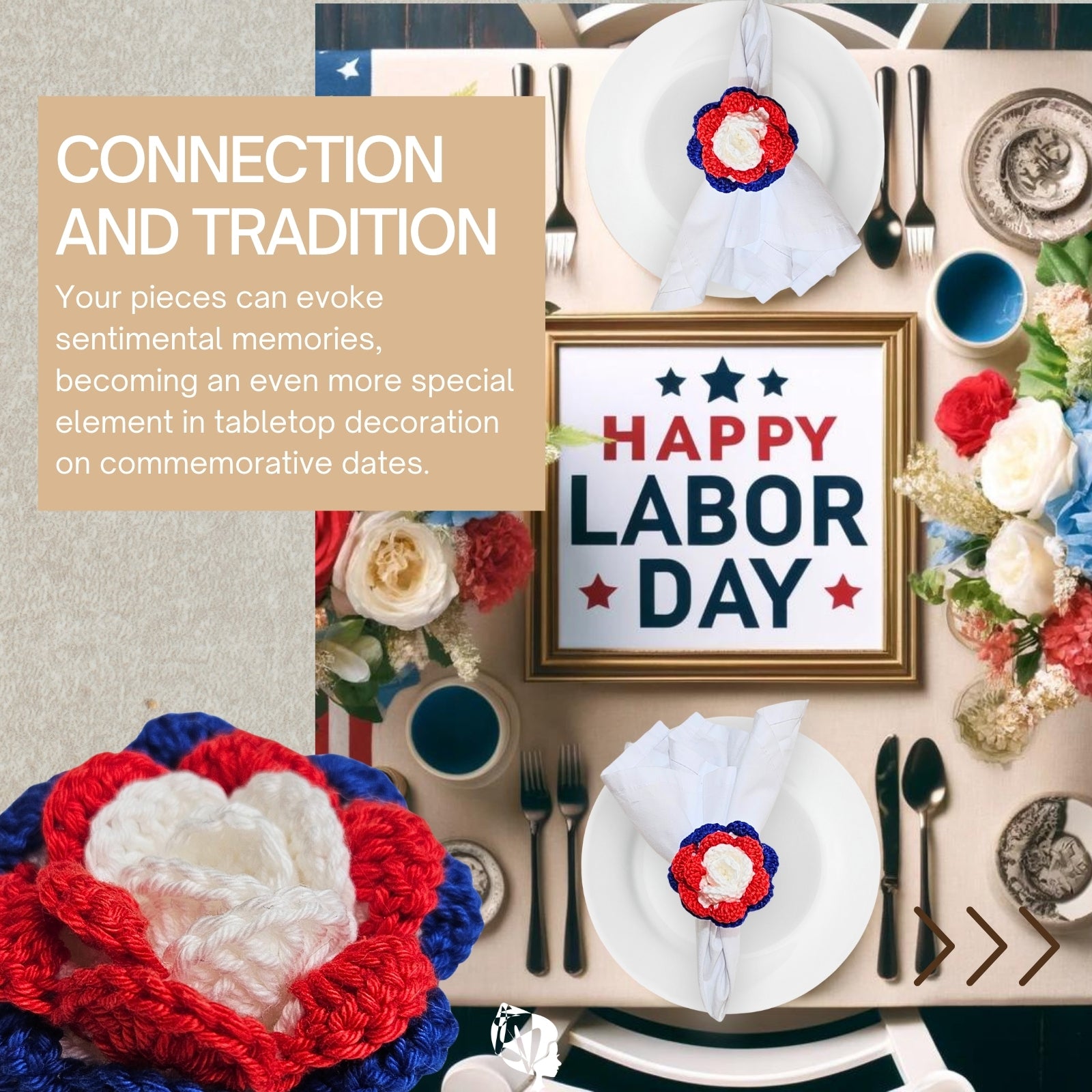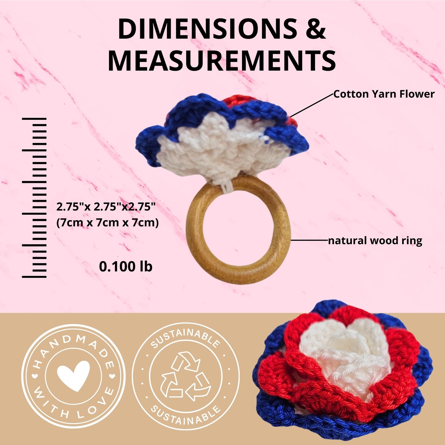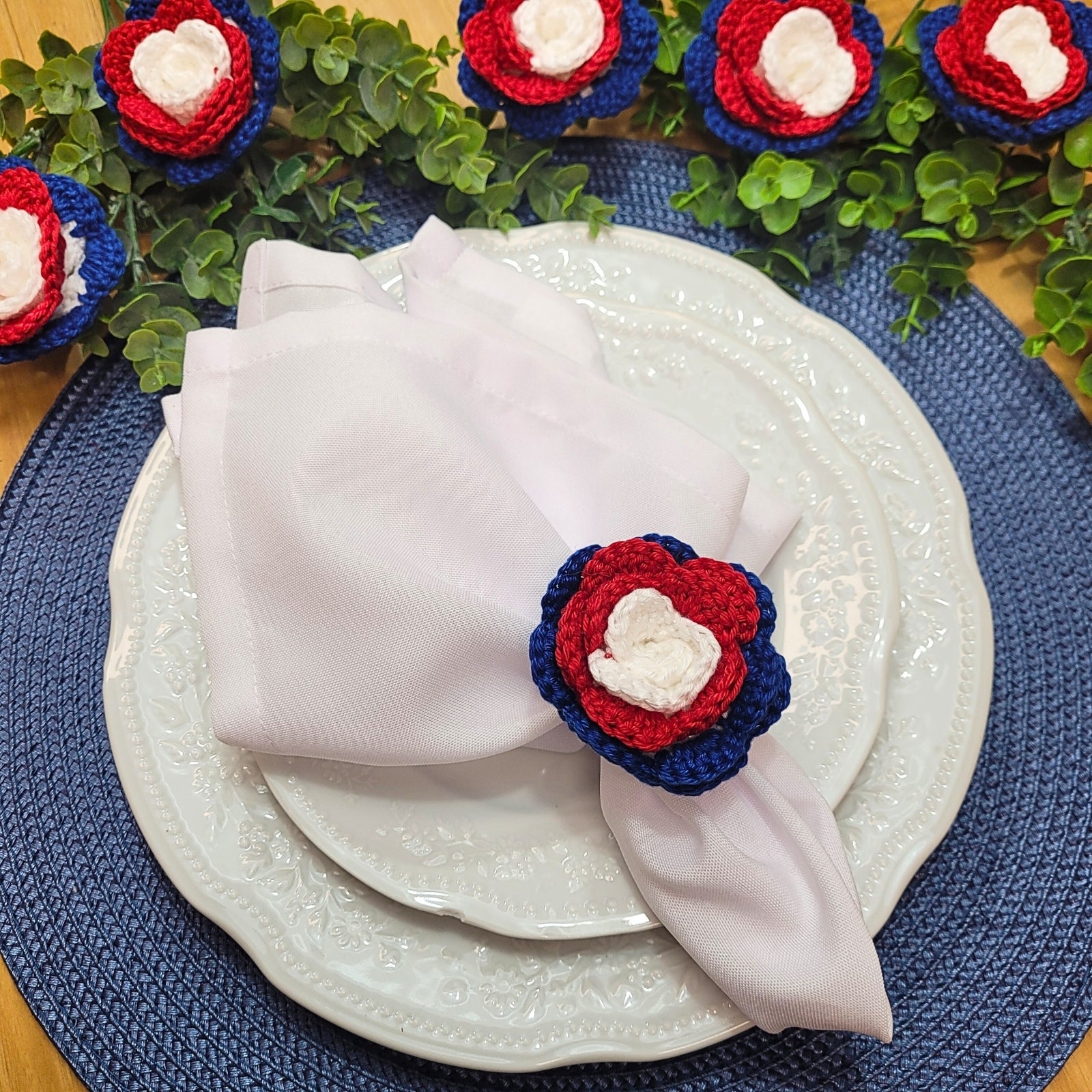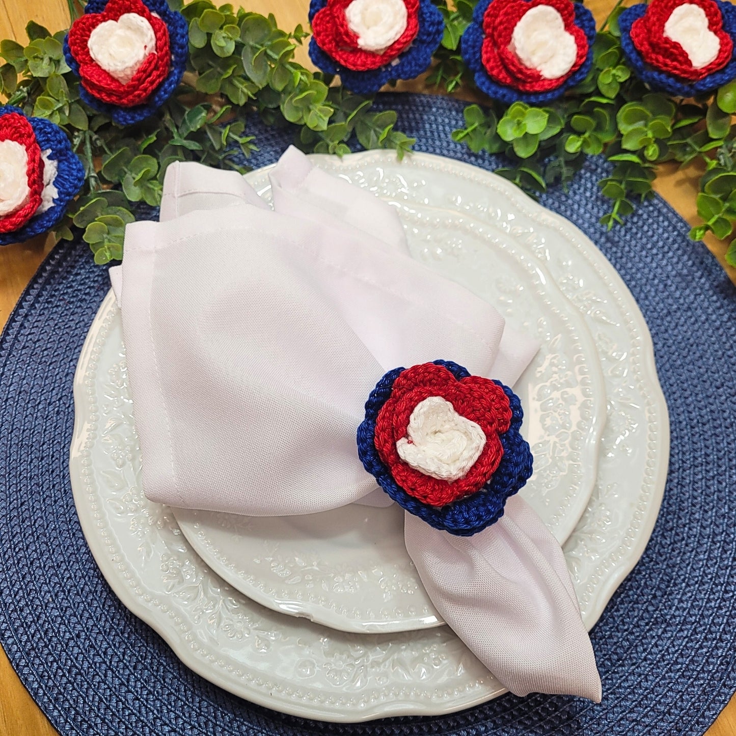 Charlo's Set of 6 USA Patriot Crochet Rosebud Napkin Rings for Independence Day, 4th of July, Memorial Day