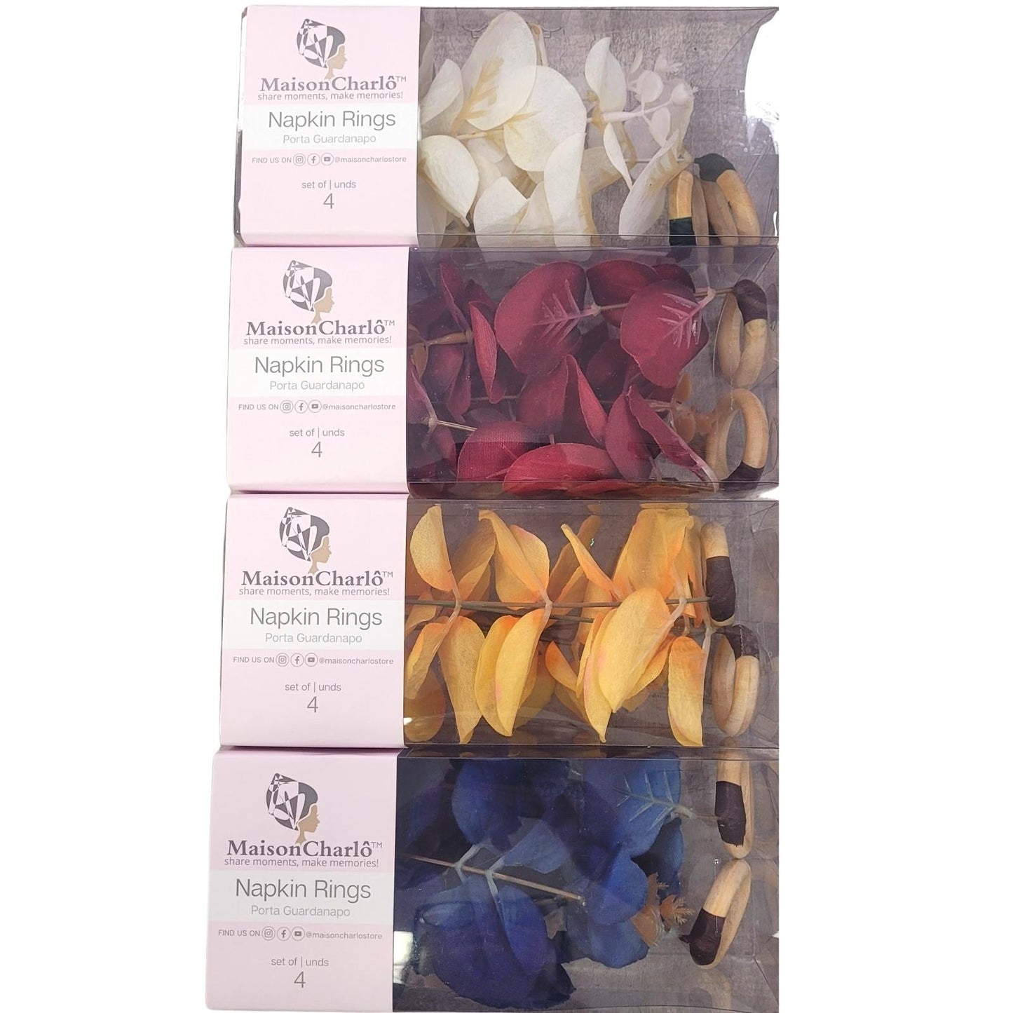 • ABOUT THE PRODUCT - Set of 4 Eucalyptus Leaf Napkin Rings, the material is Fabric (Flower) and wood ring. If you want to surprise your guests, here's a tip that will brighten up your table and is a real charm at your table is this Eucalyptus Leaf Napkin Rings. If you are going to choose eucalyptus to decorate your wedding, your home, know that it will bring freshness and naturalness to the environment