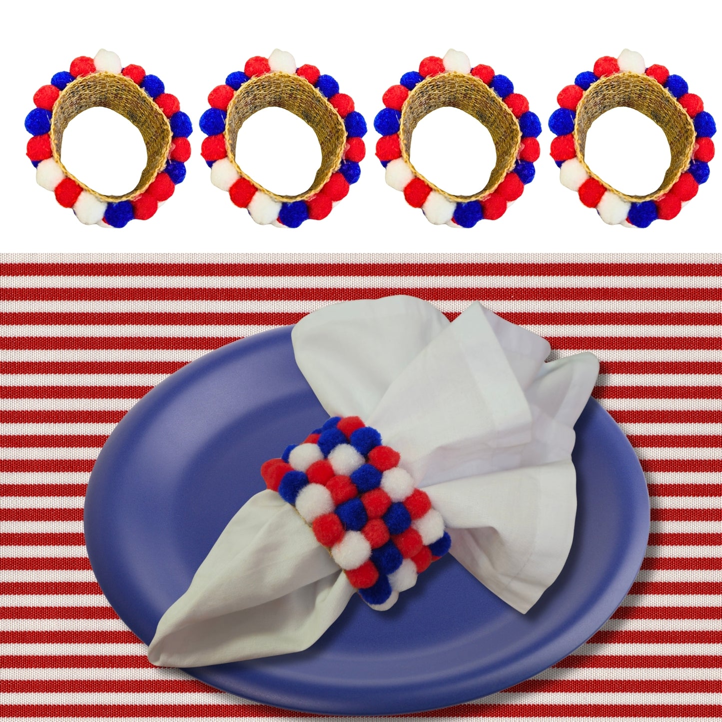 Charlo's Patriot 4th July Pom Pom Napkin Rings for Patriotic Holidays, Dinner Table Decor