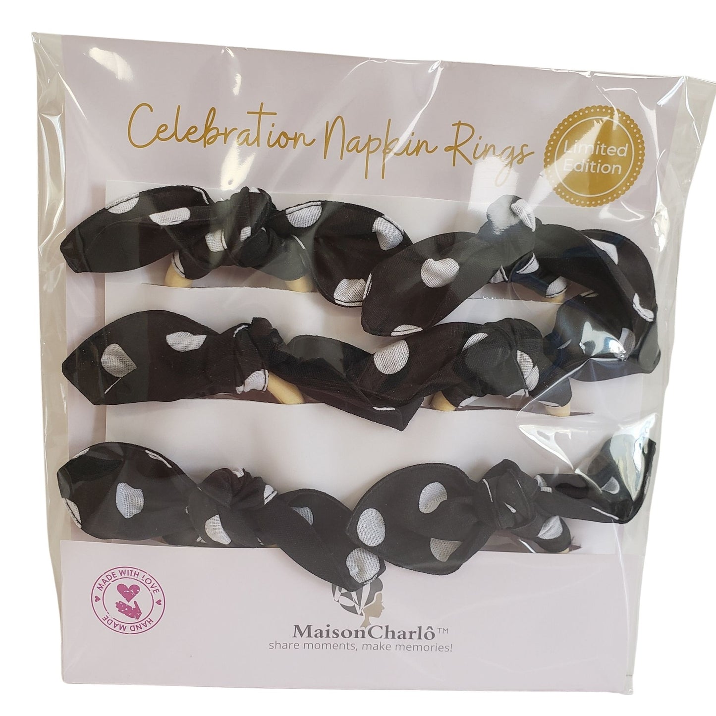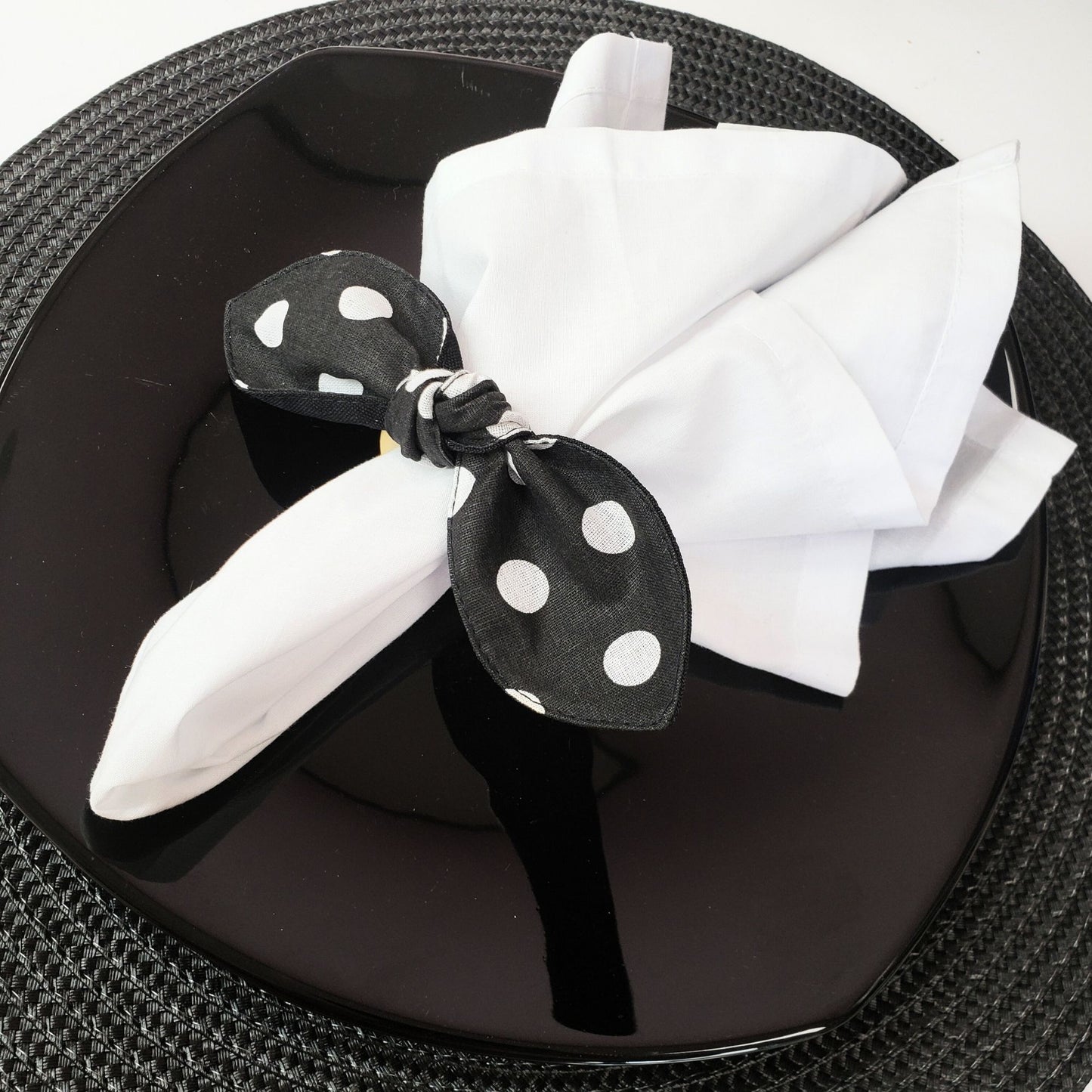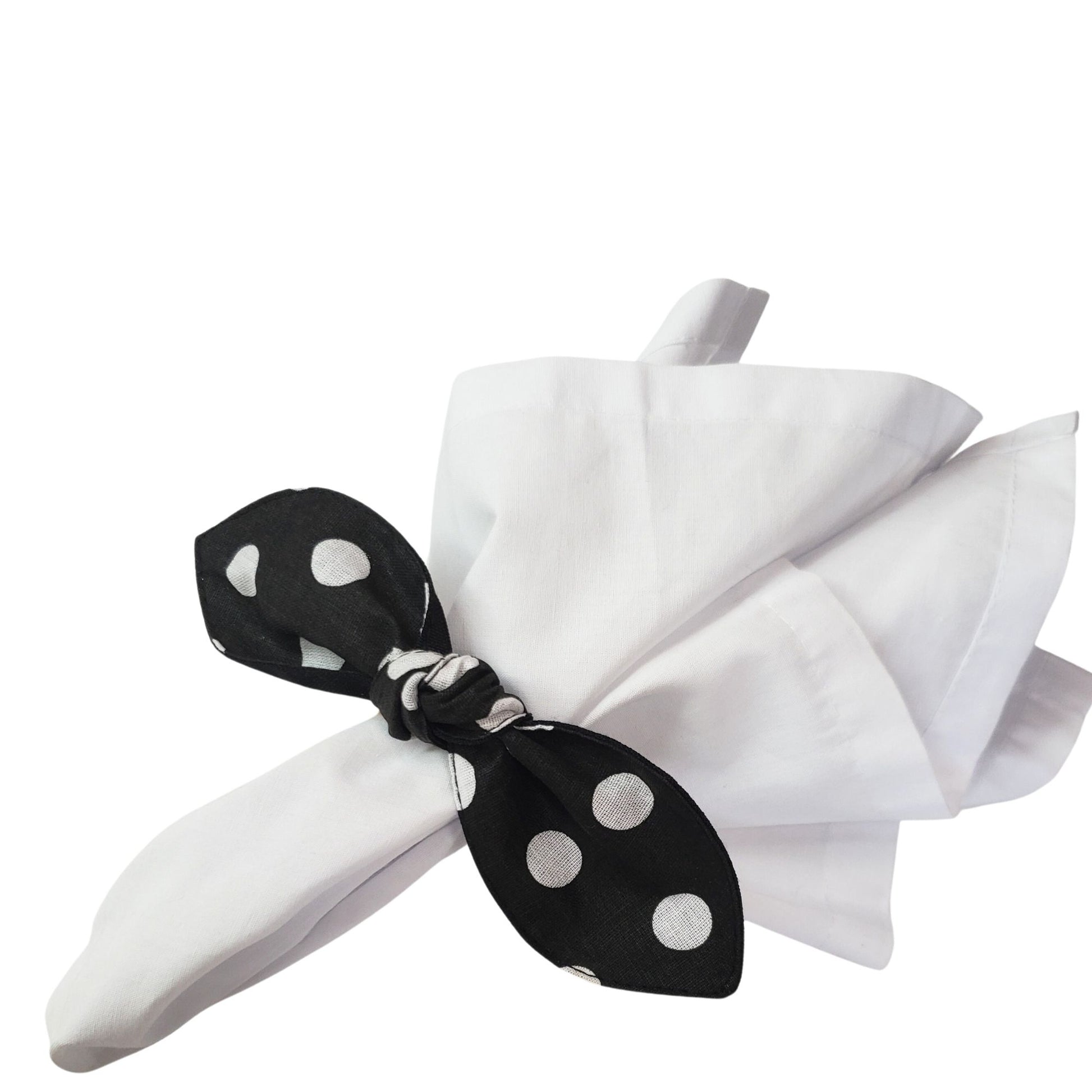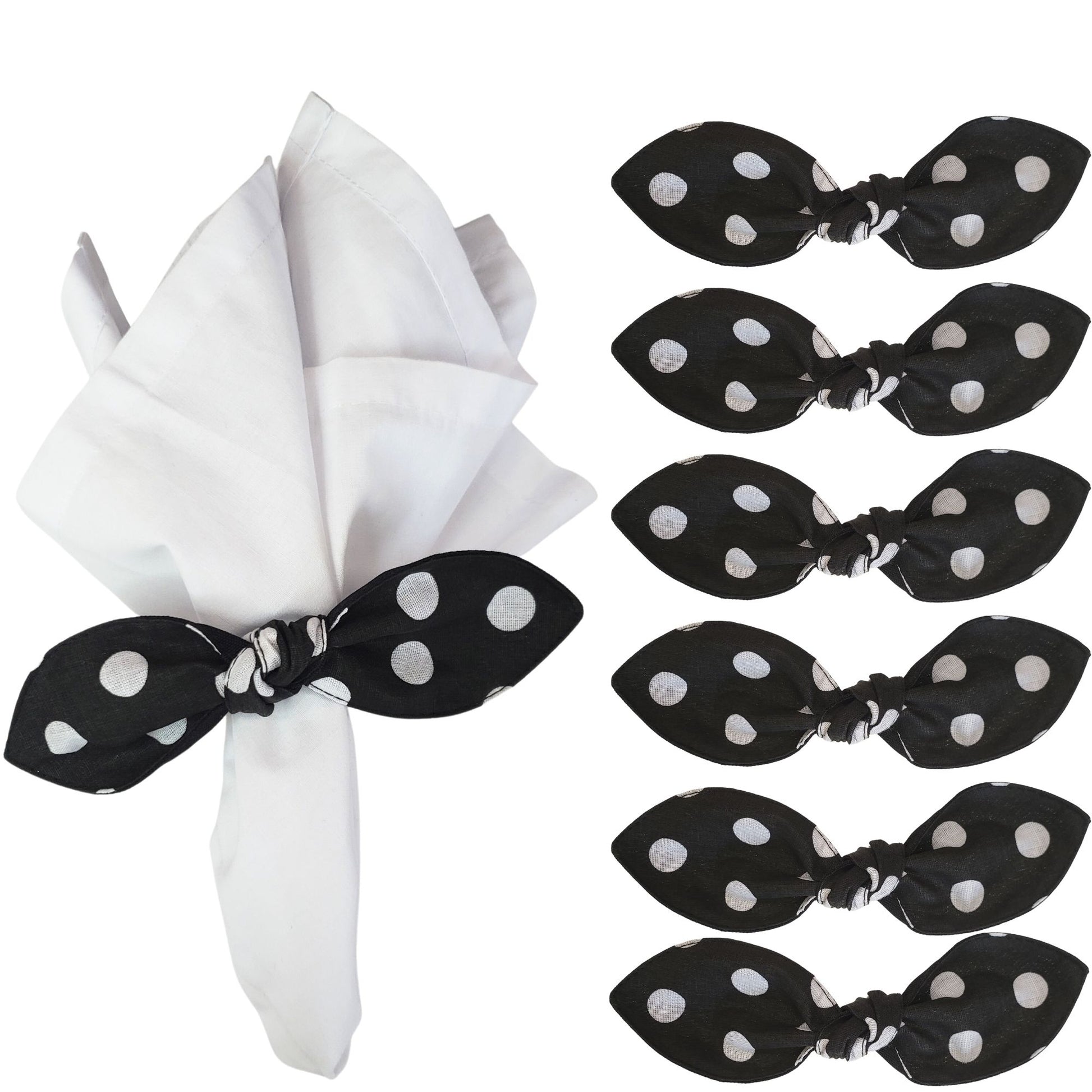 Maison Charlo | Set of 6 Ecofriendly Big Dot Polka Black Cloth Ties Napkin Rings, Christmas, Easter, Valentine's, Mother's Day