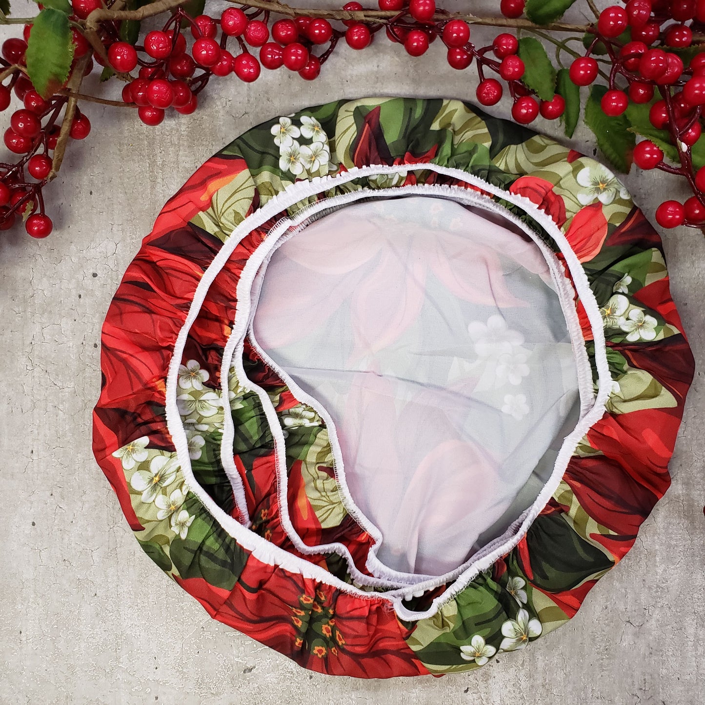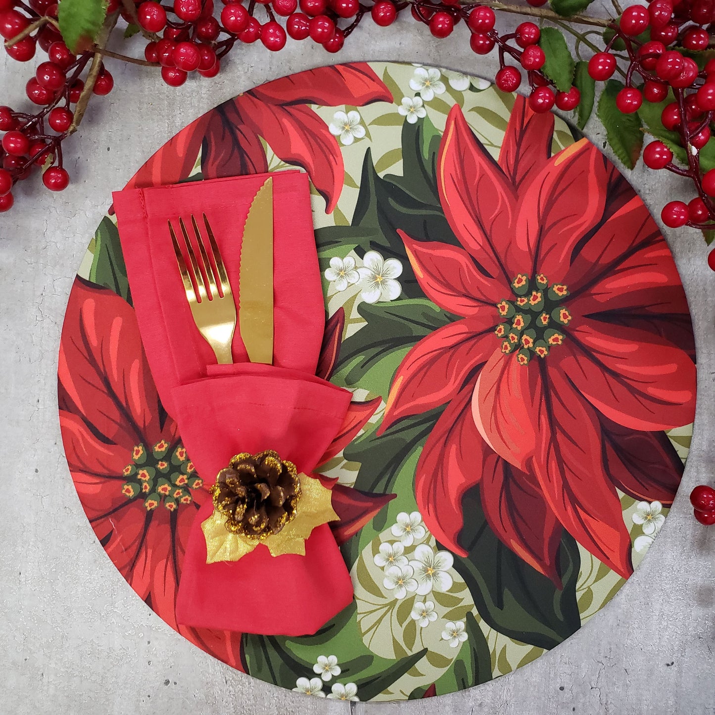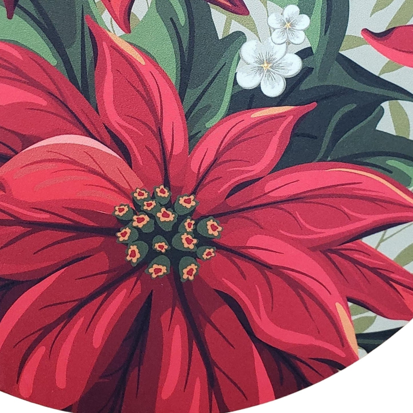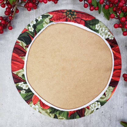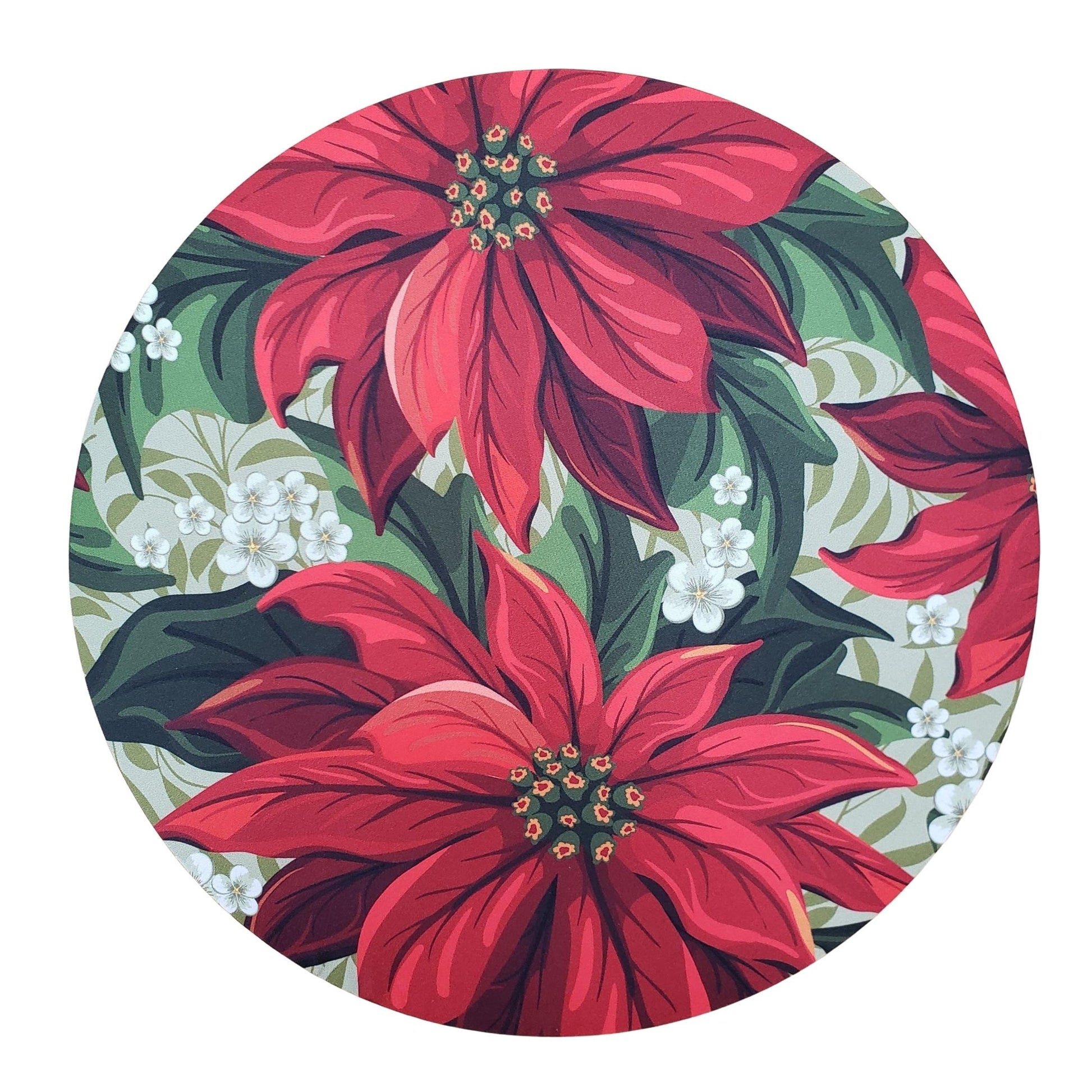 Set of 4 Round Placemats Covers Christmas Big Red Flower Cloth 14" Dia - Green