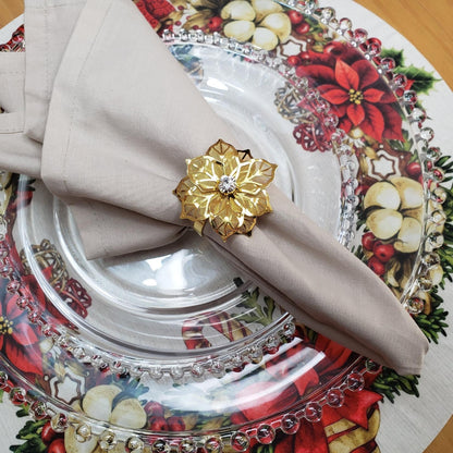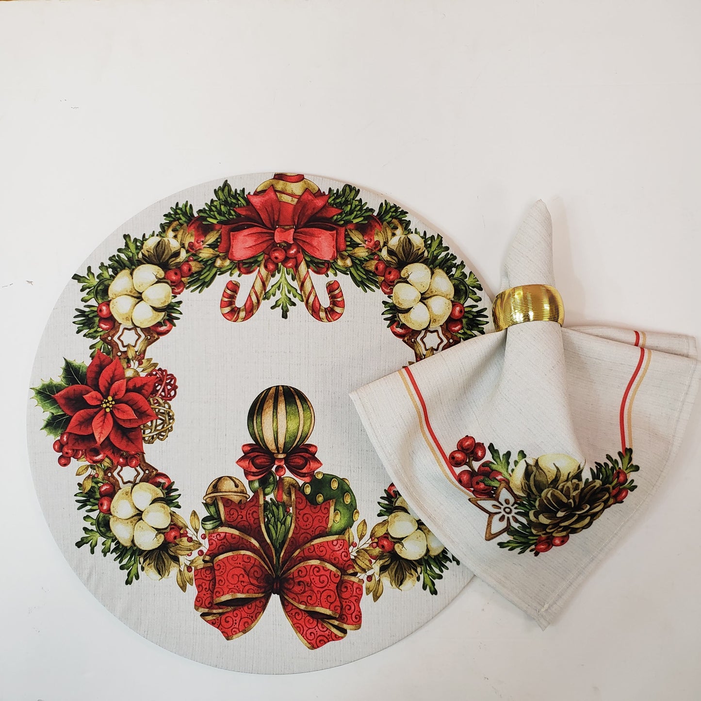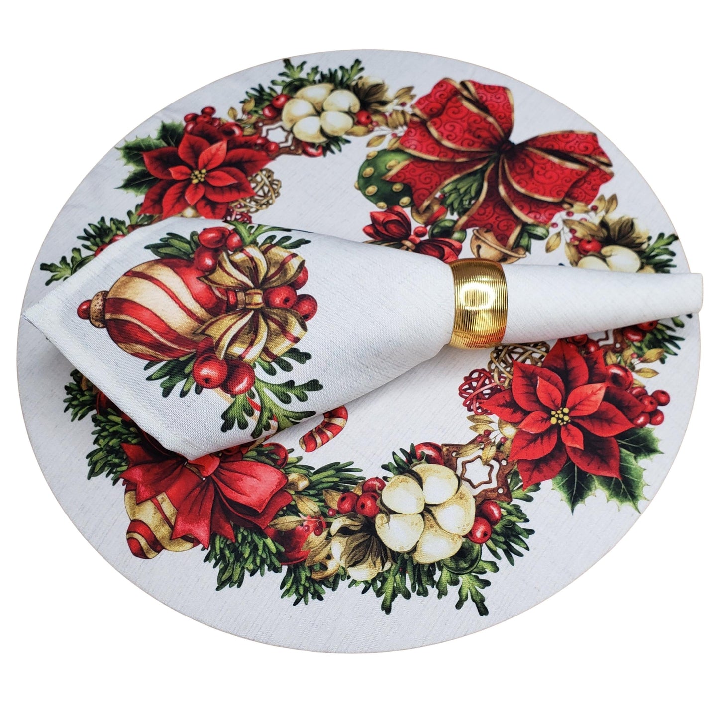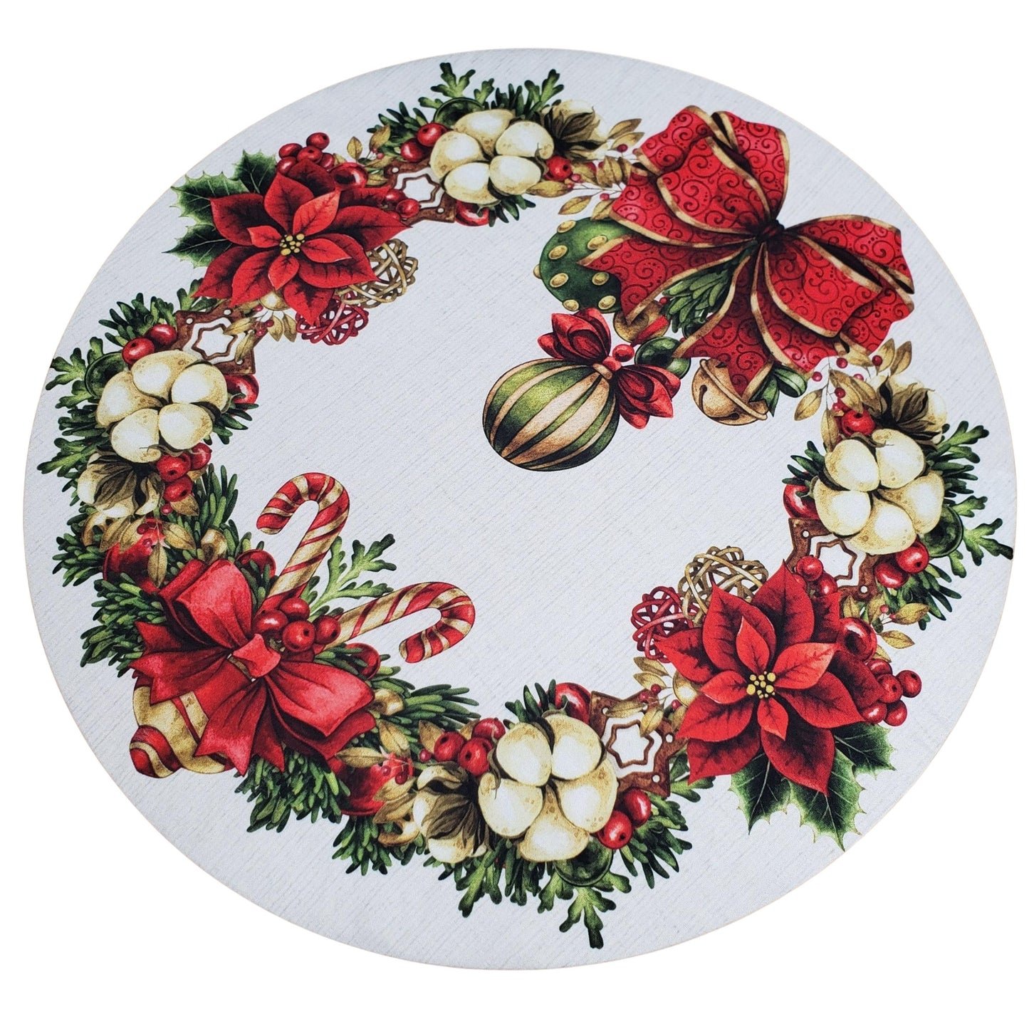 Set of 4 Round Placemats Covers Christmas Wreath Cloth 14" Dia | Beige